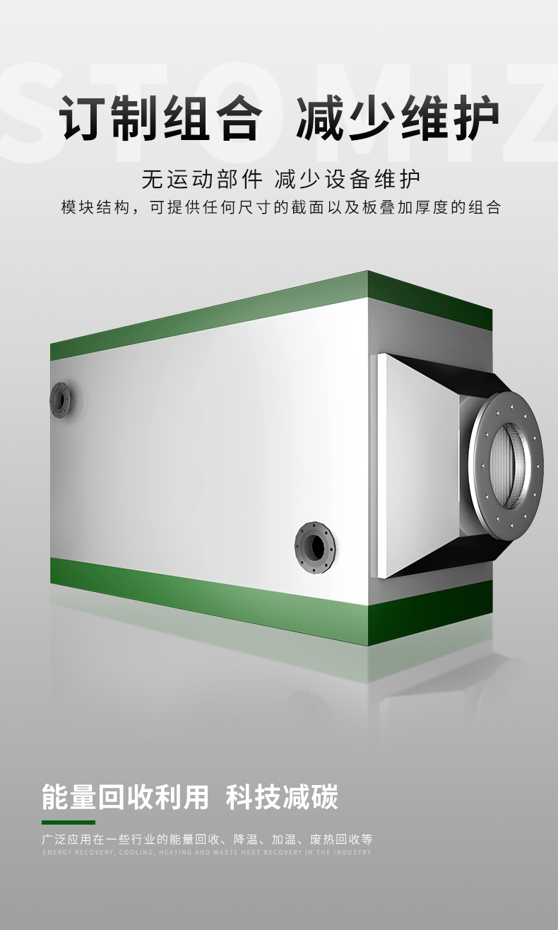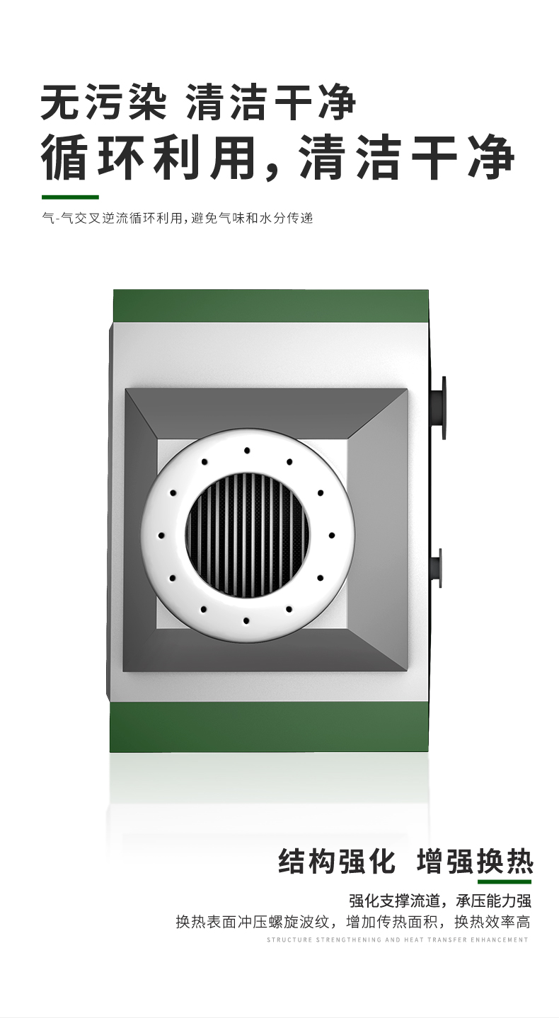 DR-IHC 智能热循回系列,通过高效热交换装置对气体进行能量交换,对工业烟气进行助燃风加热,从而实现余热回收,实现节能降耗。该智能热循回装置强化了支撑流道,增加了承压能力,换热表面增加了冲压螺旋波纹,加大传热面积,使其换热效果大大提高。