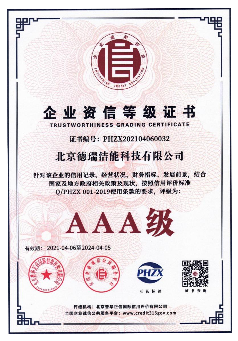 重视企业信用,是企业自觉接受社会监督,勇于承担责任、义务的承诺,是一个企业的立足之本。德瑞一路走来,始终信守合作承诺,诚信履约,树立行业标杆,实现与合作伙伴、客户等多方的互利共赢。载誉前行、继往开来。德瑞洁能此次获得“3A级企业资信等级认定”,不仅能引导行业不断增强诚信意识,也大大提高德瑞洁能的社会知名度和市场竞争力,在未来,德瑞也将不负众望,继续开拓国际市场,以产品质量和企业诚信赢得广大客户的信任。